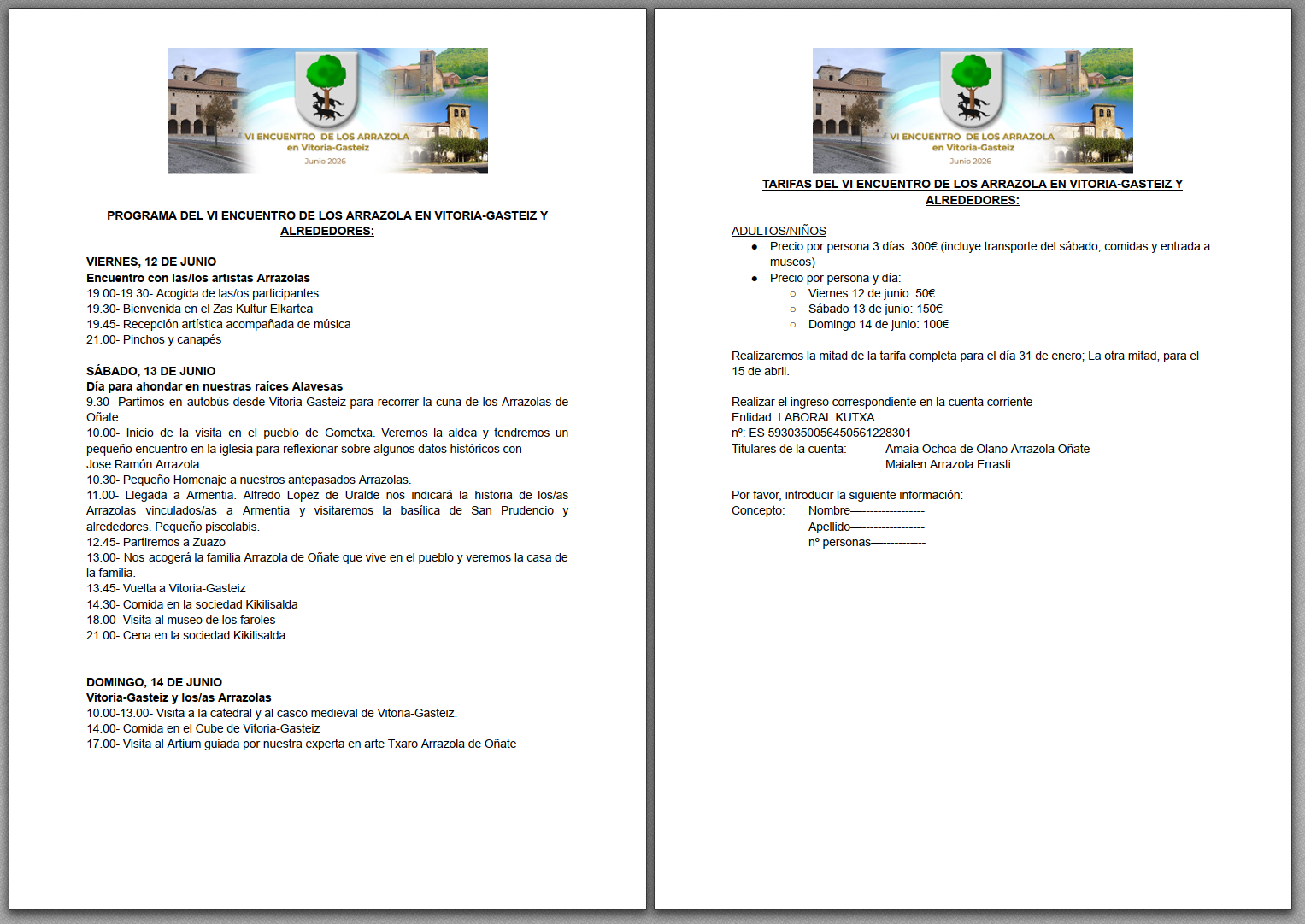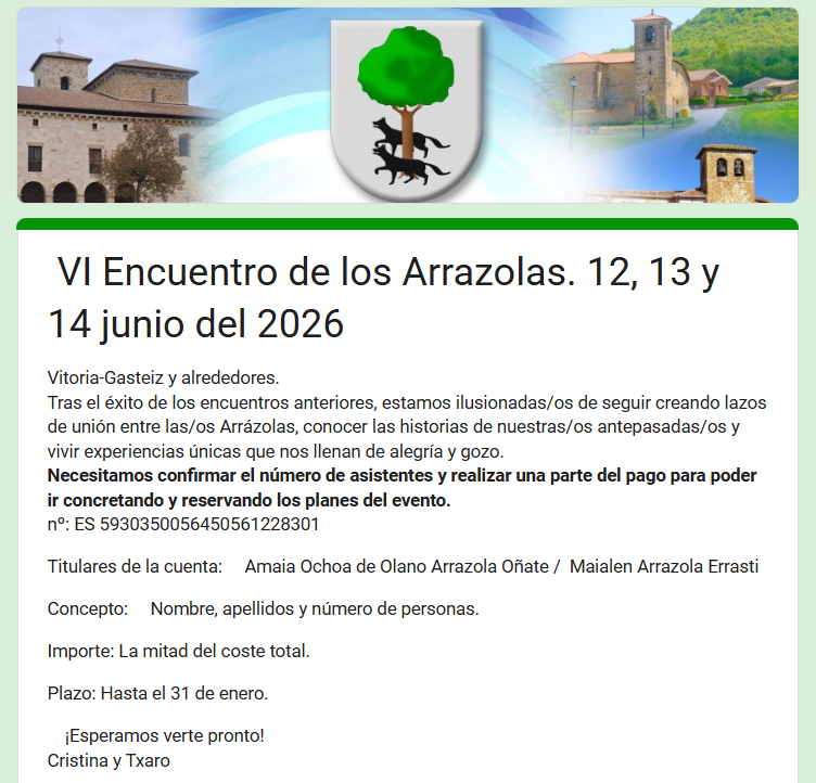 Queridas y queridos miembros de la gran familia Arrazola: Es una alegría dirigirnos a todas y todos vosotros para invitaros a un nuevo encuentro de personas que no solo compartimos el apellido, sino también la ilusión de mantener vivos nuestros lazos, conocernos mejor y seguir descubriendo nuevas historias sobre nuestros ancestros. Como en anteriores ocasiones, este encuentro será una oportunidad magnífica para convivir, intercambiar recuerdos, aprender unos de otros y seguir construyendo...